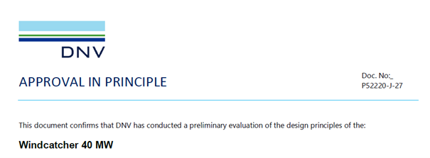 Over the last six months, our team has been focused on further maturing the Windcatcher technology through maturing the 40MW Windcatcher design. A key milestone has been to achieve an Approval in Principle from DNV, and we are happy to announce that this milestone has now been reached.