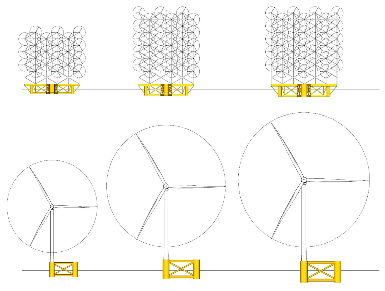 The scaling method envisaged for floating wind originates in the aerodynamic approach that has proved so successful for land-based and bottom-fixed installations: Maximizing the energy yield per turbine has been essential to halving the cost for bottom-fixed wind installations over the last decade. An aerodynamic approach is not going to deliver the cost saving results for floating wind where the support structures cannot keep up with the turbine arms-race. Luckily, floating wind can be scaled with the number of standard turbines, avoiding the major challenges the industry faces as we push the limits of individual turbine capacity.